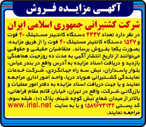 آگهی مزایده فروش شرکت کشتیرانی شرکت کشتیرانی جمهوری اسلامی ایران در نظر دارد تعداد 4337 دستگاه کانتینر مستهلک 20 فوت و 1547 دستگاه کانتینر مستهلک 40 فوت را از طریق مزایده به صورت یکجا بفروش برساند متقاضیان حقیقی و حقوقی می توانند از تاریخ انتشار آگهی به مدت ده روز جهت هماهنگی بازدید و دریافت اسناد مزایده به آدرس واقع در بندرعباس بلوار پاسداران نبش سه راه جهانگردی شرکت خدمات نمایندگی کشتیرانی هوپاد دریا واحد امور اداری مراجعه نمایند و یا جهت دریافت اسناد مزایده به دفتر امور عملیات و یازرگانی شرکت واقع در تهران خیابان قائم مقام فراهانی بالاتر از میدان شعاع نبش کوچه شبنم پلاک 101 طبقه سوم مراجعه نمایند