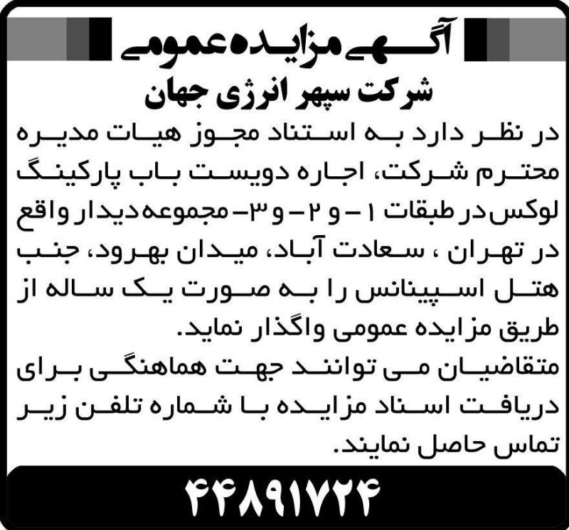 آگهی مزایده عمومی در روزنامه اطلاعات  شرکت سپهر انرژی جهان  آگهی مزایده عمومی  اجاره دویست باب پارکینگ لوکس