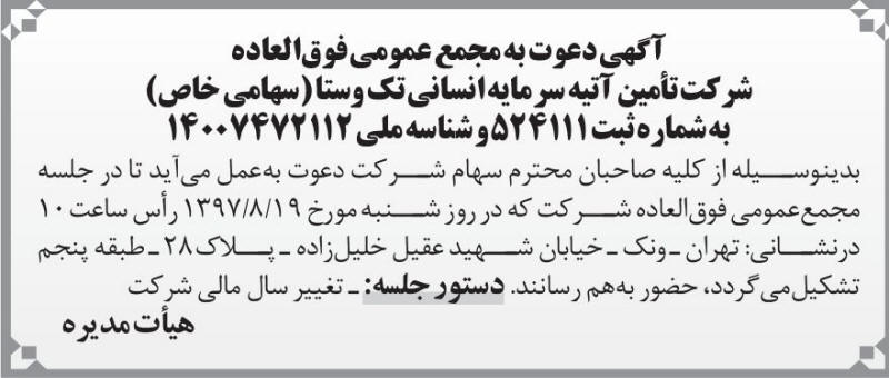 آگهی دعوت به مجمع عمومی شرکت تامین آتیه سرمایه انسانی تک وستا - بدینوسیله از کلیه صاحبان سهام شرکت دعوت به عمل می اید تا در جلسه مجمع عمومی فوق العاده شرکت که در روز شنبه مورخ راس ساعت در نشانی تهران ونک تشکیل می گردد حضور بهم رسانند - دستور جلسه تغییر سال مالی شرکت - هیات مدیره