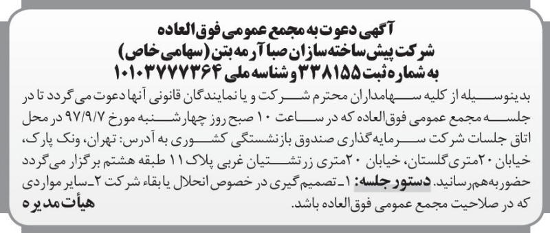 آگهی دعوت به مجمع عمومی شرکت پیش ساخته سازان صبا آرمه بتن  آگهی دعوت به مجمع عمومی